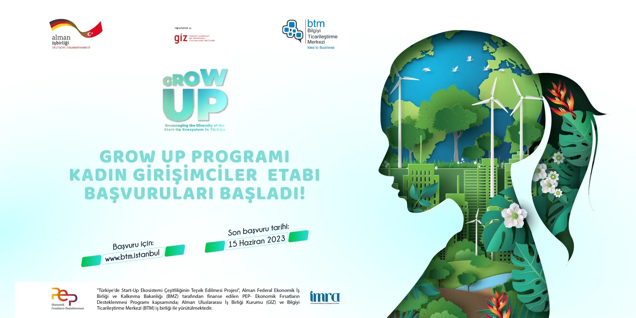 Türkiye’de startup ekosistemi çeşitliliğinin teşvik edilmesi amacıyla BTM tarafından Alman Uluslararası İş Birliği Kurumu (GIZ) işbirliği ile yürütülen ‘Grow Up’ programının kadın girişimciler etabı için başvurular sürüyor. Programla eğitimler, yatırımcı eşleştirmeleri ve sosyal uyum faaliyetleri ile Türkiye’deki girişimcilerin niteliklerinin artırılması ve fırsat eşitliği sağlanması hedefleniyor. Kadın girişimciler, program kapsamında iş kurma, iş kapasitesi ve sürdürülebilirlik becerilerini geliştirme ve yol haritalarını belirlemeleri için çeşitli faaliyetlere katılacak. Başta tarım, gıda ve yeşil girişimciliği destekleyen sektörler olmak üzere tüm alanlarda faaliyet gösteren girişimlere açık olan programa, 15 Haziran’a kadar başvuru yapılabilecek. www.btm.istanbul